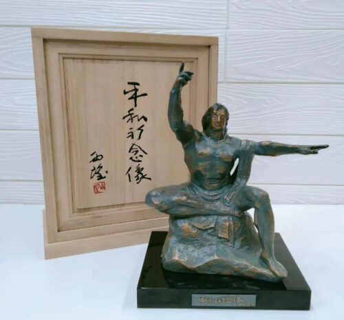 !彫刻家北村西望作の平和祈念像のミニバージョンになります。長崎県の平和公園にある銅像をそのままスケールダウンした作品で、いかに本家が巨大か思いしらされます。銅像や彫像、裸婦像の買取は当店へお任せください